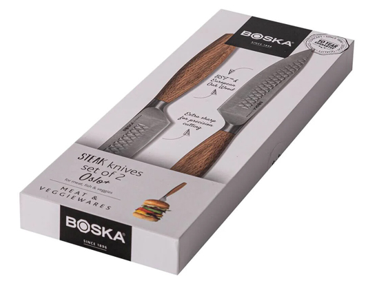 Deze steakmessen van roestvrijstaal combineren scherpte met een comfortabel handvat van Europees eikenhout. Dankzij het gladde lemmet snijd je moeiteloos vlees, vis en groenten – in de keuken én aan tafel.